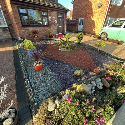 Before the upgrade, this Sawtry front garden featured a combination of loose decorative stone, uneven planting areas, and ageing pathways that required frequent upkeep. While the layout had character, the multiple surface types and worn edging made the space feel disjointed and harder to maintain. Loose gravel regularly shifted out of place, weeds were difficult to control, and the overall appearance lacked the clean, structured finish expected from a modern front garden.